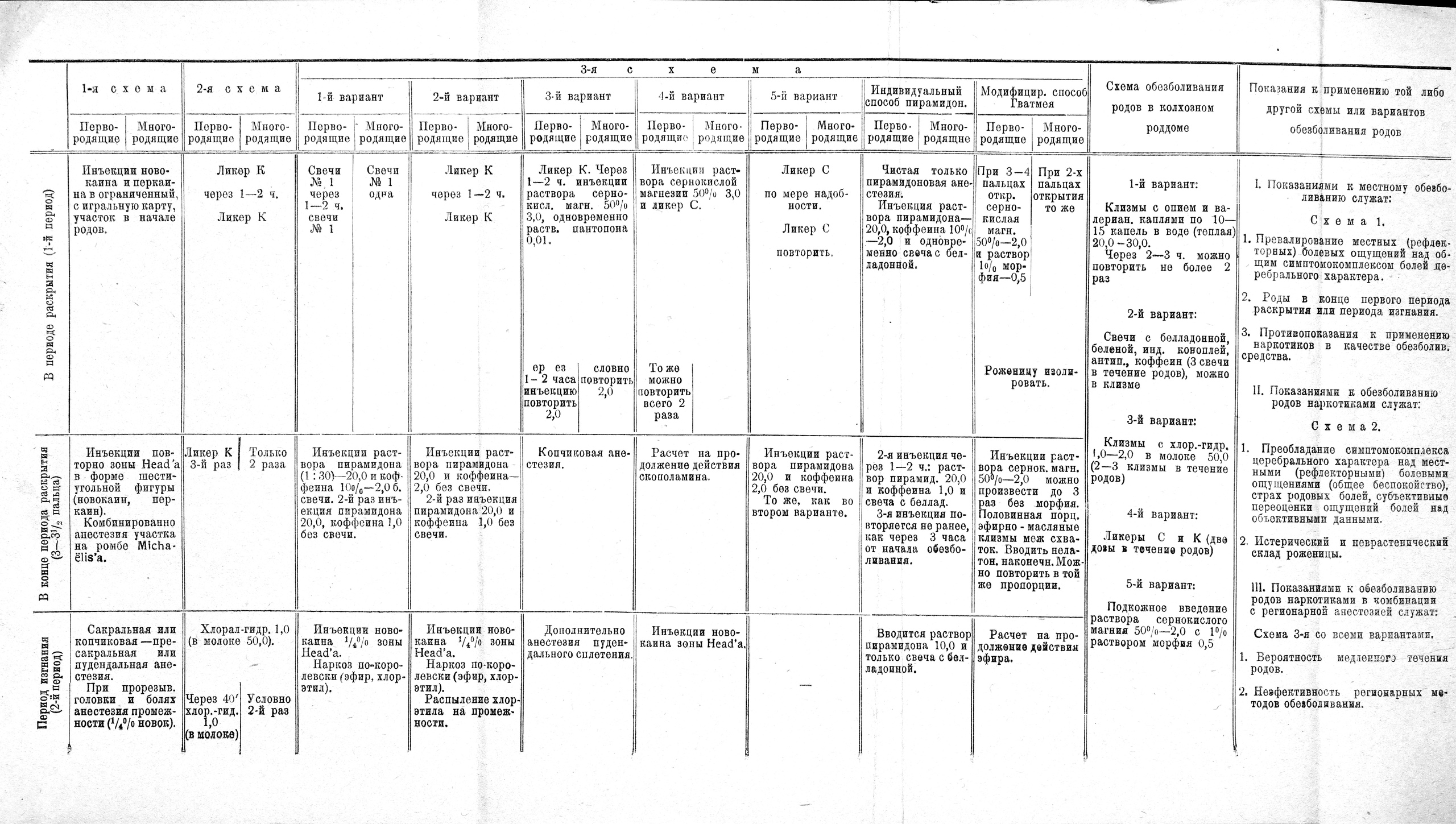 Наконец, укажем, что наша клиника, испытав различные комбинации обезболивающих роды средств, пришла к заключению о необходимости индивидуально вариировать эти комбинации и в практической своей работе пользуется приложенной схемой.