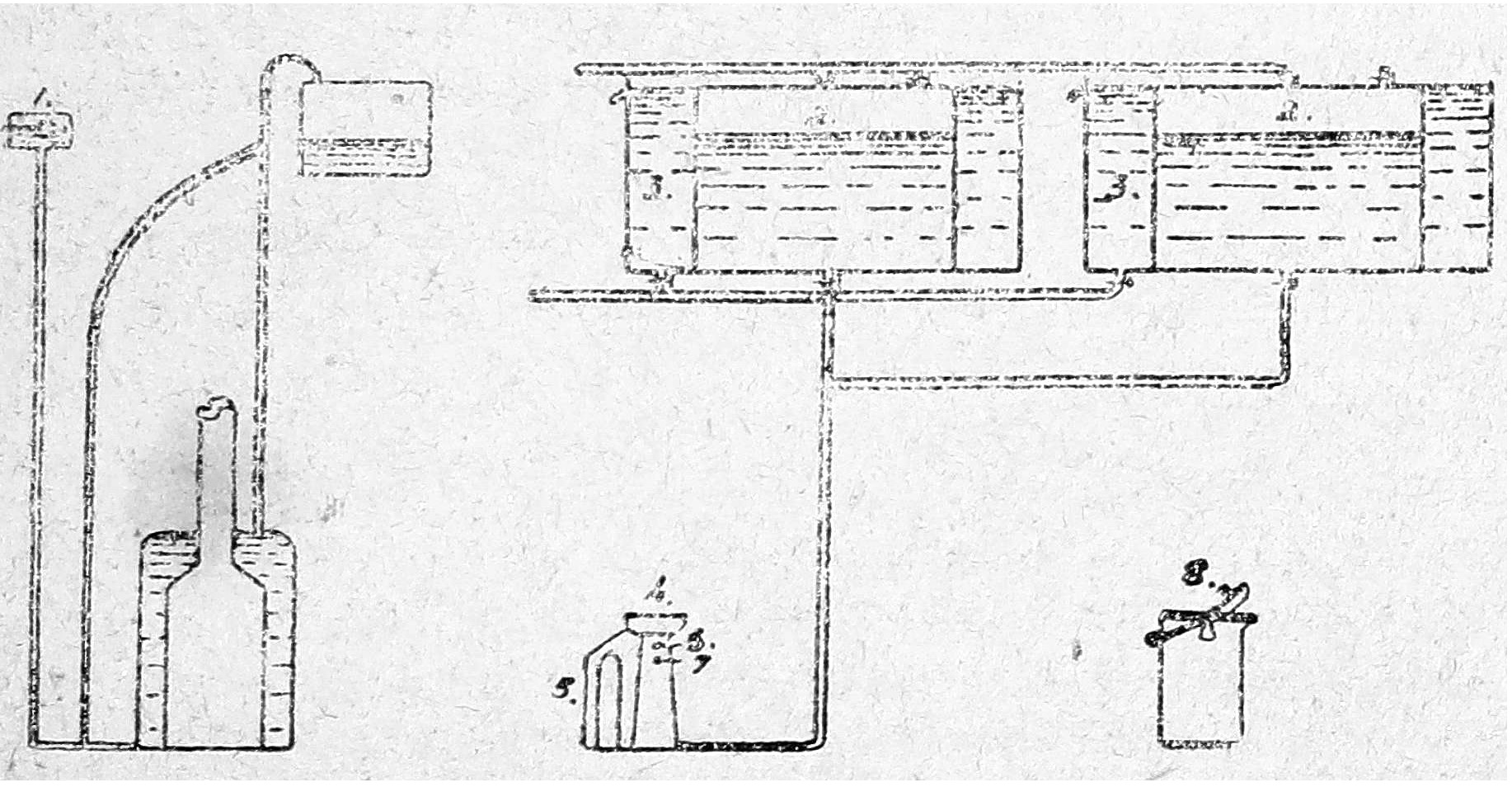 Для правильного кипячения воды имеется общеизвестная установка „Титан“. Кроме того, инженером Несмеяновым предложена установка — кипятильник такого же типа, но с некоторыми усовершенствованиями, дающими возможность не только кипятить но и охлаждать ее тут - же и направлять остуженную, кипяченую воду по трубам прямо в цеховые фонтанчики (см. схему