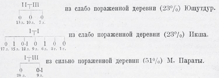 Важное влияние семейных моментов могло быть учтено нами и при поверхностных наблюдениях. Так, в лесной части Козмодемьянского кантона население старается брать жен с горной, непораженной, здоровой стороны, вливая этим свежую кровь. Это, как и следовало ожидать, иногда помогает, иногда нет, т. к. женщина может быть здоровой в здоровой местности, но не иметь нужной наследственно обусловленной сопротивляемости к зобу. Обратно, в горной стороне мы видели случаи зоба, занесенные из луговой лицами, жившими там, работавшими там и т. д.; на семьях это обычно не отражается.