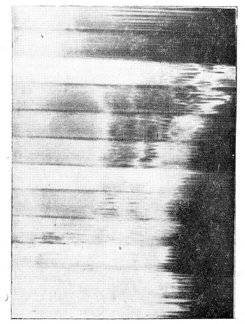 Частота колебаний легко определяется по количеству зубцов в каждой полоске кимограммы. В наших случаях, где пробег решетки занимает 45—50'' число зубцов непосредственно показывает частоту колебаний в данный период времени. Длину волны мы узнаем по отрезку кимограммы с одинаково расположенными зубцами. Так, на снимке 1 на протяжении 8 см в каждой полоске имеется по три симметрично расположенных зубца. Перемножив эти числа, мы получаем скорость распространения волны на большой кривизне, т. е. 24 см в минуту. Амплитуда зубцов у большой кривизны больше, чем у малой, и по мере приближения к выходу она постепенно увеличивается. В средней части большой кривизны амплитуда зубцов равняется 5—10 мм. На соответственных участках малой кривизны отмечается амплитуда в 3—5 мм. В пилорическом отделе амплитуда колеблется от 15 до 20 мм. Частота колебаний от 21/2 до 3½ в минуту при продолжительности периода в 15—30 сек. Длина волны колеблется от 6 до 10 см, в среднем она равняется 8 см. Скорость распространения волны определяется 15—25 см в минуту.