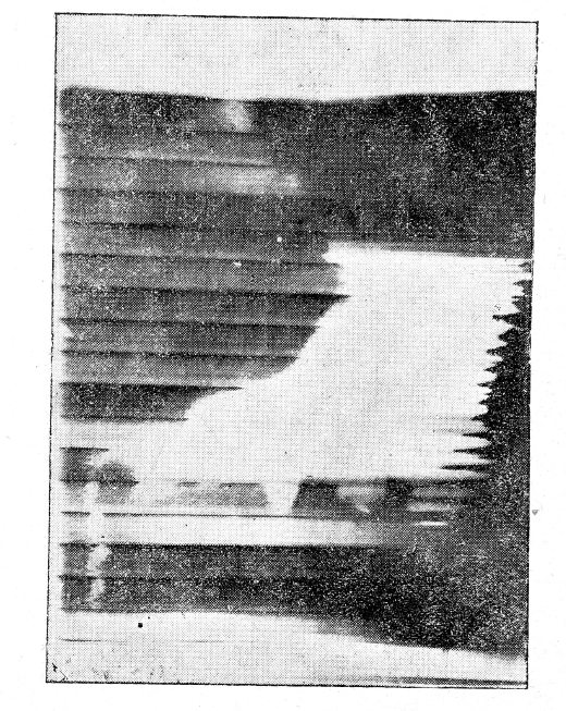 Значительные изменения представляют также кривые рентгенокимограмм оперированного желудка, в особенности, после радикального вмешательства. Так, на кимограммах резецированного по Бильроту желудка мы видим в промежутках одновременное появление зубцов с одинаковой амплитудой вследствие систолического сокращения стенок желудка. Перистальтических колебаний в этих случаях не наблюдаем (рис. 6).