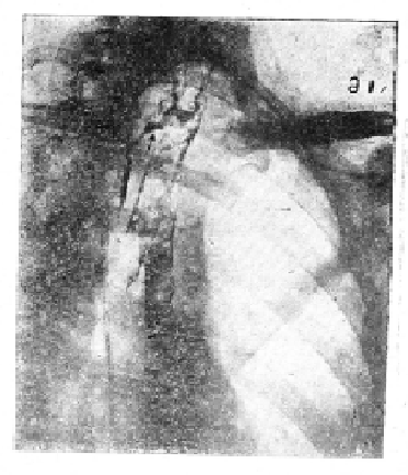 13/11 1938 г. больной X. вновь обратился с жалобами на внезапно появившийся во время приема пищи сильный кашель, одышку, общую слабость и резкое похудание. Рентгенологически, как и при первом исследовании пищевода определяется стойкое сужение с неровными изъеденными контурами на высоте тел тех же позвонков и затекание в трахею контрастной взвеси на этом же уровне, сопровождающееся приступами сильного кашля, доходящего до рвоты.