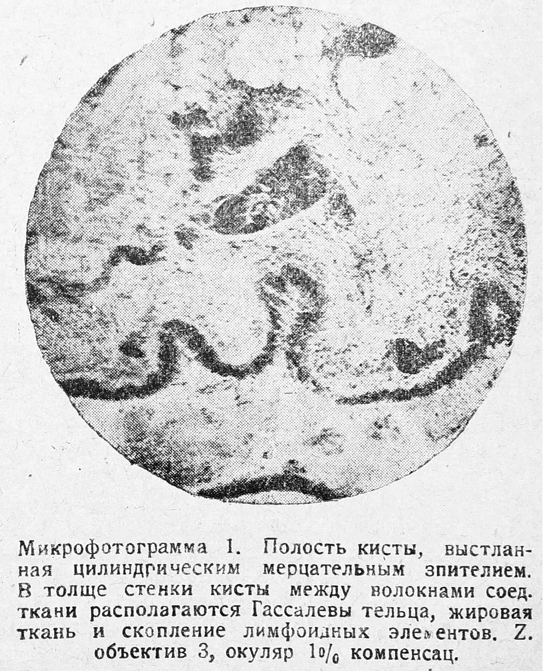 Гистологическое исследование. Полость кисты выстлана многорядным мерцательным эпителием, клетки которого не на всем протяжении одинаковы; в некоторых участках они плотно прилежат друг к другу и принимают вытянутую удлиненную форму, в других же местах между клетками имеются незначительные промежутки, и они принимают кубическую форму. Встречаются также участки, где эпителий теряет характер мерцательного и переходит в простой цилиндрический. Внутренняя оболочка кисты образует глубокие врастания эпителия в толщу стенки ее, эти врастания имеют сильно ветвистый характер, образовывая глубокие, очень разветвленные бухтообразные углубления. В соединительной ткани мало клеточных элементов. В толще стенки кисты, окруженной соединительнотканными волокнами, располагаются скопления эпителиальных клеток концентрического расположения. Между подобного рода скоплениями эпителия встречаются клетки лимфоидного типа. Просвет кисты и бухтообразных углублений ее выполнены эпителием в стадии дегенерации. При изучении препаратов под большим увеличением видно, что ядра эпителия внутренней оболочки кисты интенсивно воспринимают основную окраску, величина и форма этих ядер различны: то они правильно округлой формы, располагаются у основания клетки, то удлиненной формы и занимают центральную часть клетки. Протоплазма эпителиальных клеток мелко зерниста. Те скопления эпителиальных клеток, которые заложены в стенке кисты, имеют форму кубического или плоского эпителия, местами приобретая концентрическое расположение и уплощаясь напоминают Гассалевы тельца.