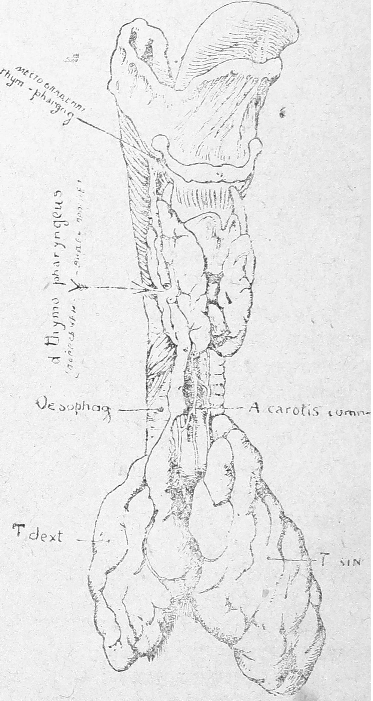 При анатомическом исследовании thymus’а у трупов различных возрастов, нам удалось в одном случае у 12-летнего мальчика обнаружить следующее: зобная железа больших размеров располагалась на обычном месте, и от нее—с правой стороны от верхнего полюса, тянулся тяж, диам. 0,3 см с ясно выраженным просветом; тяж этот направлялся кверху и выше подъязычной кости терялся в мышцах боковой стенки глотки (см. рис.). Венгловский в своей работе пишет, что ему, а также и другим авторам, не встречалось ясно выраженных остатков d. thymo-pharyngeus у взрослых, идущих от зобной железы в виде непрерывного тяжа к боковой стенке глотки, который в таком виде существует только у зародыша, и если бы он был обнаружен, то доказательность происхождения боковых кист шеи из остатков d. thymo-pharyngeus была бы несомненной. Данные Венгловского, а также, невидимому, и других исследователей, оказались неубедительны вследствие недостаточного количества исследованных ими трупов. И нам это удалось обнаружить только один раз на 250 трупах, у которых (для другой работы) тщательно исследовались щитовидная, паращитовидная и зобная железы.