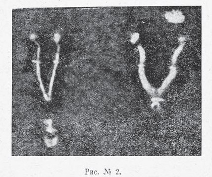 Гистологическому исследованию были нами подвергнуты половые органы мышей №№ 2 и 4, серии 0 и всех мышей серий I, II и III. Макроскопически у них бросалось в глаза резкое уменьшение в величине, в сравнении с контрольными, всего внутреннего полового аппарата. Разница достигала до уменьшения, примерно, в два раза, касаясь в равной степени матки, яичников и труб, благодаря чему сохранялась симметрия органов (см. рис. № 2). Общая картина соответствовала одному из сравнительно распространенных пороков развития, именно, гипоплазии j внутренних половых органов. Микроскопически также преобладали количественные изменения, равномерно распространяясь на все части половой сферы. Количественные различия в сторону уменьшения и являются характерными для гистологической картины половых органов исследованных животных. Незначительное количество фолликулов от средних до мелких, уменьшение их общей величины, незначительная величина фолликулярных полостей, равно уменьшение самих фолликулярных клеток, меньшее количество желтых тел, отсутствие последних в случаях непоявления течки, их общая недоразвитость—вот что можно было гистологически отметить в яичниках подвергавшихся утомлению мышей в сравнении с контрольными. Особенно резко эта картина выявлялась у животных, не имевших до вскрытия течки,—здесь она давала впечатлении общей задержки в развитии половой железы, ее анатомической неполноценности, чему, вполне допустимо, соответствовала и ее функциональная