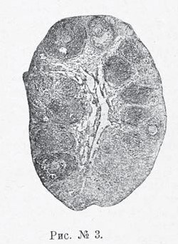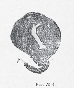 недостаточность (см. рис. № 3). В матке количественная разница выступала еще резче (см. рис. № 4). Соответственно уменьшению всего органа оказывались недоразвитыми и все его составные части,—мышечный слой и слизистая оболочка были слабо развиты, железы уменьшены и в количестве и величине, интерстициальная ткань слизистой слабо выражена (производит впечатление атрофии), покровный эпителий ниже нормального, просвет матки уменьшен. Следовательно, и здесь имела место картина общей задержки развития матки, остановки на известной стадии детского состояния ее, инфантилизма,/даже более того—ее гипоплязии.
