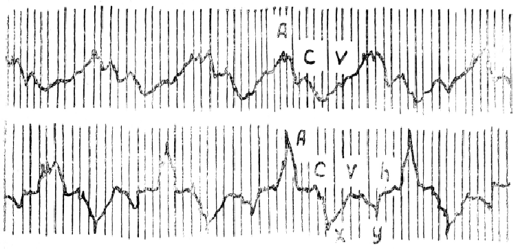 Изучая венный пульс при печеночно-яремном рефлюксе, имеющем значение для диагностики правожелудочковой недостаточности и застойной печени, мы нашли, что под влиянием давления на печень у больных со стенозом левого венозного отверстия в некоторых случаях происходит не только набухание шейных вен, но и переполнение кровью всего правого отдела сердца. С большей силой сокращается при этом предсердие — становится очень высоким предсердный зубец А, резко увеличивается (вследствие переполнения кровью правого предсердия) зубец ѵ, больше крови устремляется в правый желудочек — поэтому появляется выраженное падение кривой (отрицательный зубец У) и появляется зубец венного пульса h.