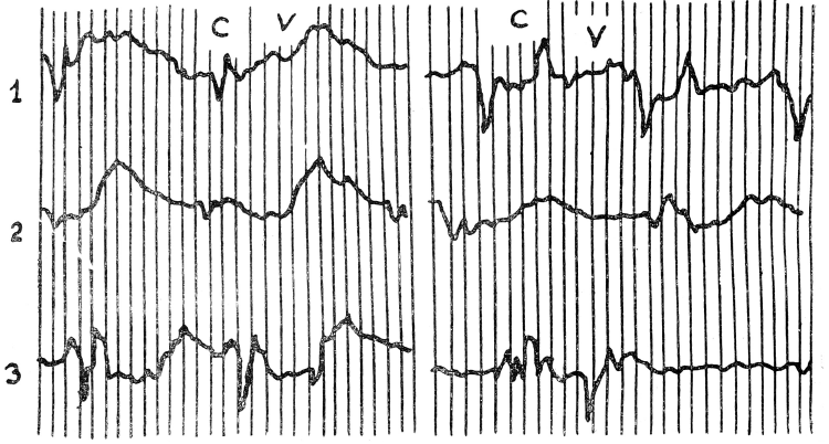 На пьезограмме венного пульса у б-ной М. — бигеминия. Можно видеть, что при недостаточности трехстворчатого клапана экстрасистолы отличаются от нормальных систол высоким артериальным зубцом С и более низким, чем обычно, венозным подъемом ѵ.