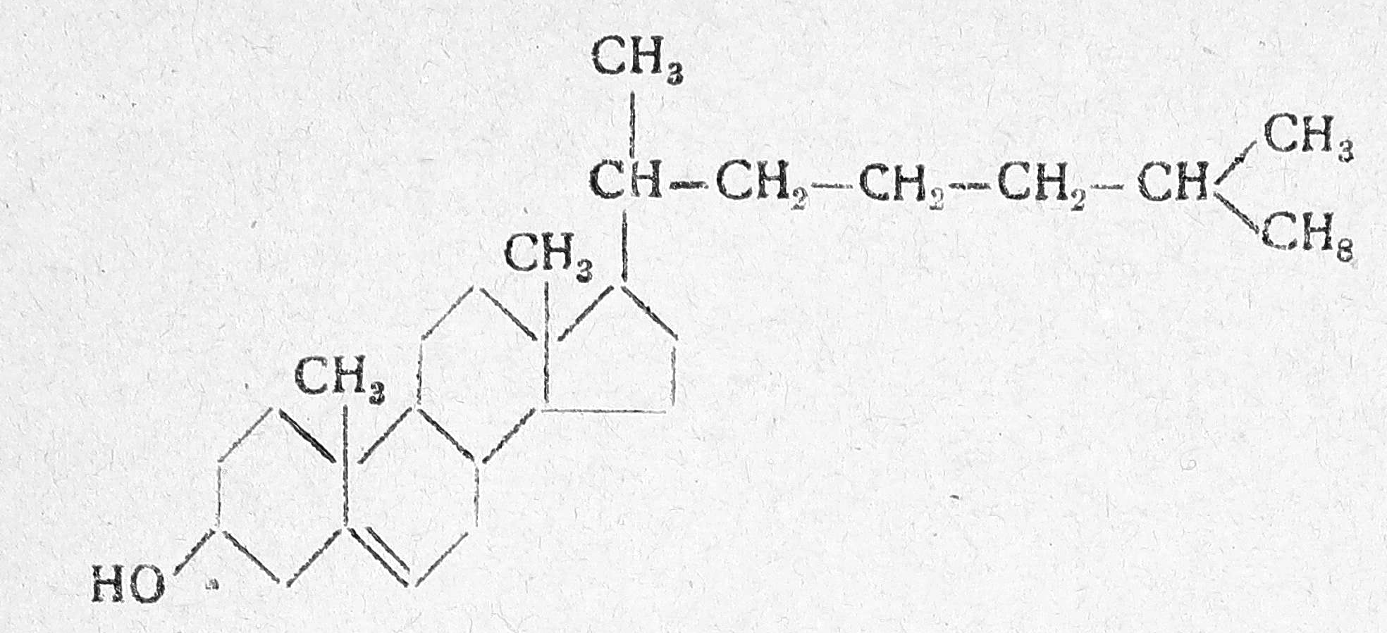 Вариант структуры холестерина, предложенный Розенгеймом и Кингом, представлял тоже самое с той только разницей, что вместо нарбоксильной группы наверху молекулы находилась длинная боковая цепь. Последовательный распад боковой цепа давал литохолевую кислоту, дезокеихолевую, холевую и фолликулин.