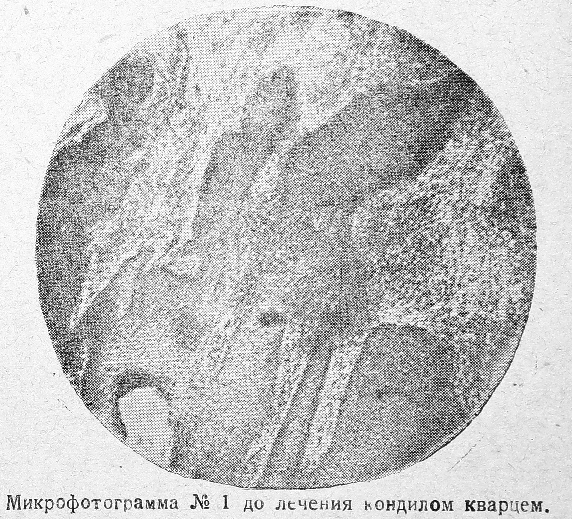 Лечение острых кондилом кварцем—вопрос новый, и потому, испробовав этот метод лечения, считаем нужным поделиться его результатами. Мы наблюдали два случая.
