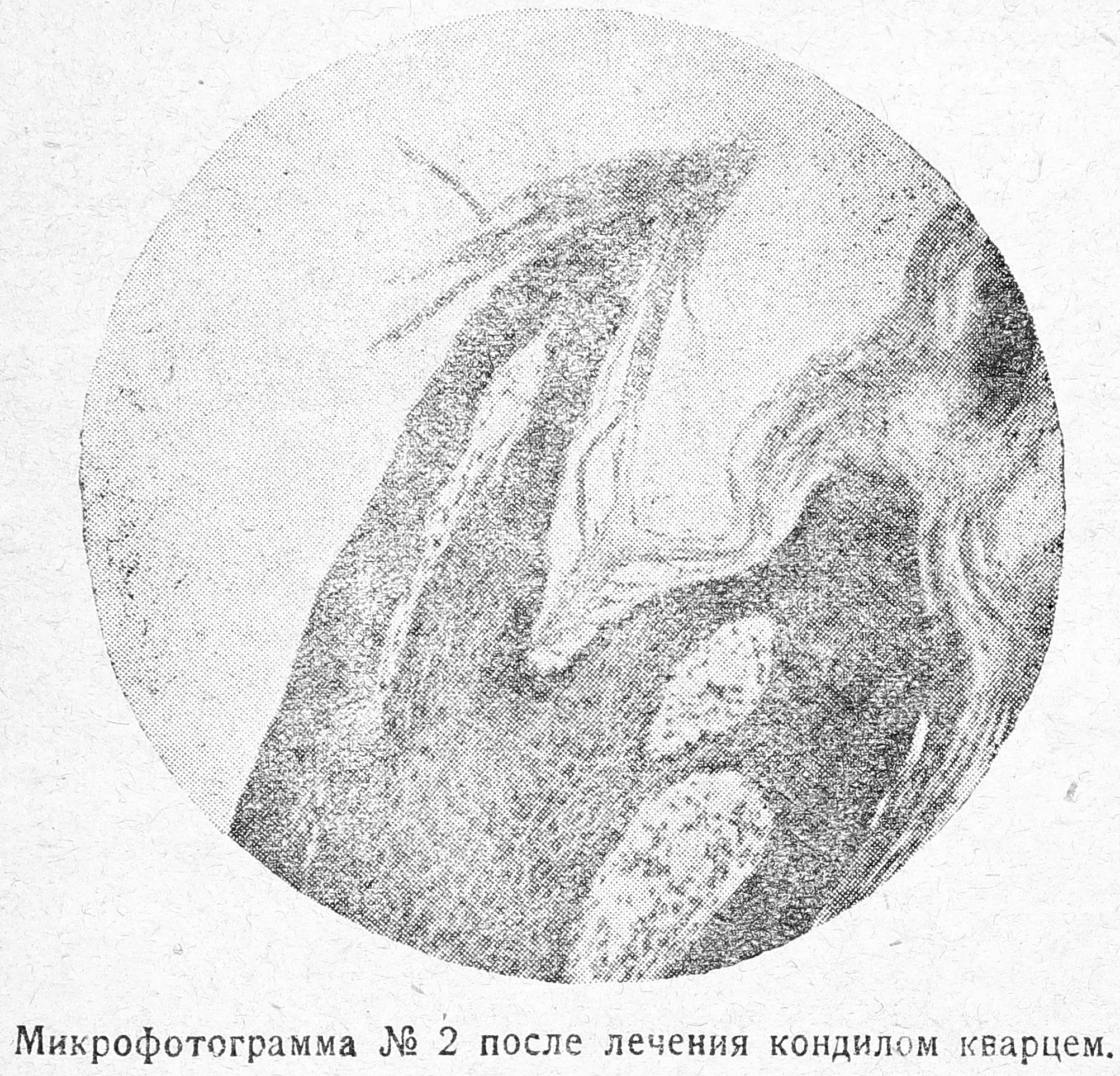 Кварцоблучение вызвало регрессивные изменения, приведшие к остановке роста и атрофии кондилом. Кроме того, кварц, как бактерицидный фактор, уничтожает причину, вызывающую рост кондилом. Относительно бактерицидности мы уже говорили, но хочу все же подчеркнуть, что с увеличением дозы бактерицидное действие, повидимому, увеличивается (Каганер, Стояновская).