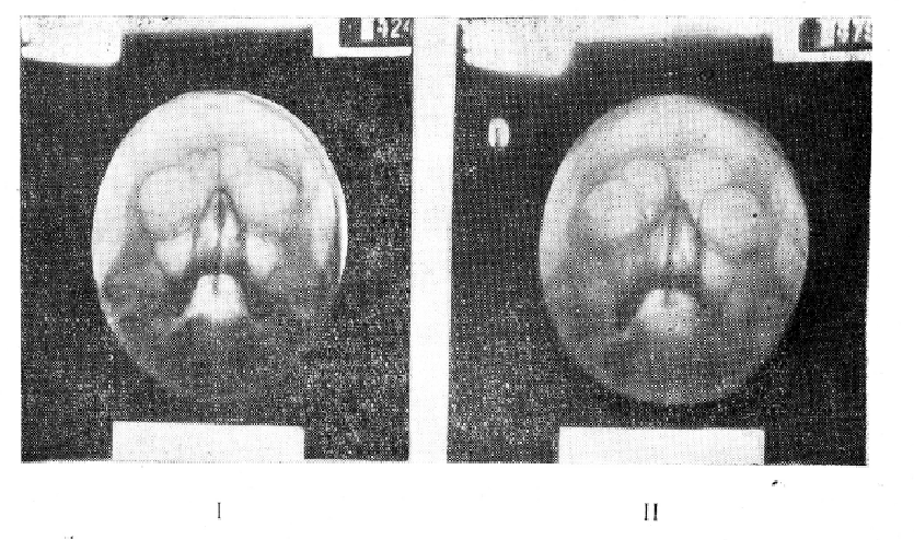 В ряде случаев для уточнения характера выявленных изменений и контроля за эффективностью лечения больные направлялись на повторное флюорографическое исследование придаточных пазух носа. Из 13 больных, наблюдавшихся в динамике, у 4 при повторном исследовании наблюдалось появление горизонтальных уровней жидкости в пазухах, где ранее определялись однородные интенсивные затенения; у 2 — восстановление нормальной пневматизации пазух; у 7 картина поражений пазух на флюорограммах не изменилась.