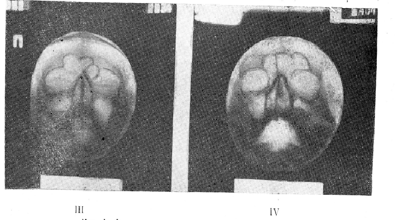 Из 76 больных с жидкостью в пазухах у 21 определялись горизонтальные уровни жидкости, у 14 — параболические границы, у 25 — сочетание жидкости и гиперплазии слизистой оболочки. Приводим несколько наших флюорографических наблюдений (рис. 1—I, II, III, IV).