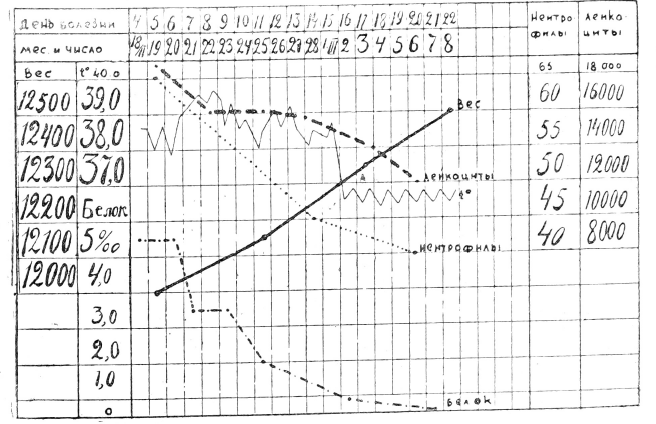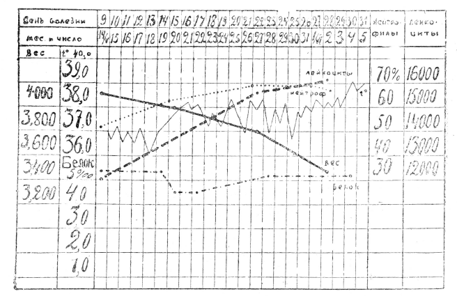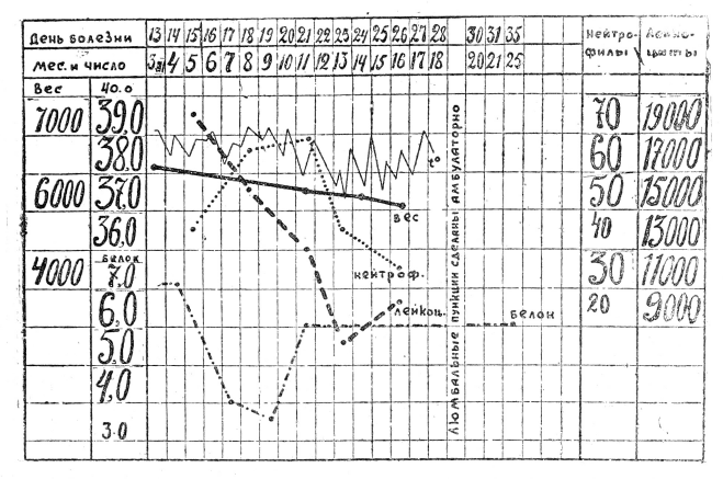 Иногда у больных количество лейкоцитов и процент нейтрофилов в крови снижается, но кривая белка держится на одном уровне, вес больного падает, температура все время держится на высоких цифрах; в таких случаях наступает летальный исход.
