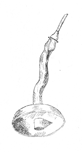 Так, в 1933 г. было приготовлено: 46.399 см3 сыворотки, в 1934 году 47.980 см3, в 1935 г. 68.518 см3, в 1936 г. 111.340 см3, в 1937 г. 169.625 см3. Источниками получения крови для приготовления сывороток были: 1) родители, помещающие детей в ясли и лечебные заведения, 2) платные доноры, 3) плацентарная кровь и 4) реконвалесценты. Стремясь к достижению большей стерильности при взятии крови, мы ввели применение резиновых колпачков. Резиновые колпачки нами изготовляются из баллонов достаточной емкости следующим образом: вырезывается кусочек диаметром 5—6 см, который благодаря сферической форме баллона получается со значительной вогнутостью с одной стороны. В центре такого кружочка делается овальной формы отверстие для резиновой трубки диаметром ½ см и длиной 15 см, с таким расчетом, чтобы резиновая трубка плотно входила в отверстие. Колпачок одевается на резиновую трубку и помещается на расстоянии 4—5 см от конца с таким расчетом, чтобы его вогнутая поверхность была обращена к нижнему ближайшему концу резиновой трубки. На противоположный, более отдаленный конец трубки одевается пункционная игла, и все смонтированное таким образом кипятится. Во время пункции вены резиновый колпачок, будучи обращен вогнутой поверхностью вниз (в сторону подставленного для собирания крови цилиндра), плотно закрывает последний, гарантируя от загрязнения вытекающую в цилиндр кровь (см. рис.) Использование такого рода колпачков за последние 4 года дало нам возможность получать кровь, совершенно стерильно без единого случая прорастания.