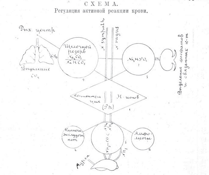 1.' Ph. крови регулируется комплексом буферов, с одной стороны связанным с дых. центром (2) и с почками (3), с другой стороны—с амфолитами (6) т. е. веществами, смягчающими реакцию: гемоглобин, белки, амино-к-ты; в-третьих, действующий осредняюще NH3 печеночный регулятор (5) и в-четвертых желудочно-киш. регулятор