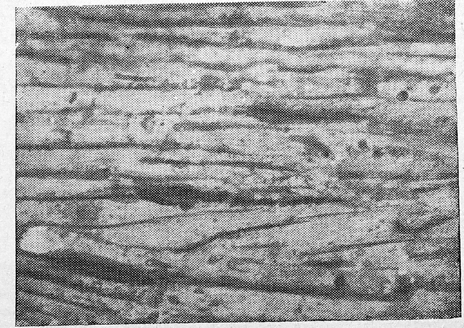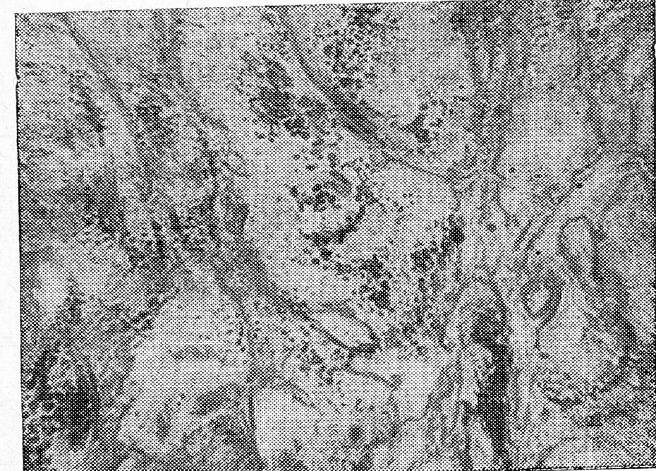 В волокне сердечной мышцы больной К-, 24 лет, с давностью заболевания 3 года, с кальцинозом створок митрального отверстия, наблюдалось понижение содержания гликогена (рис. 1).