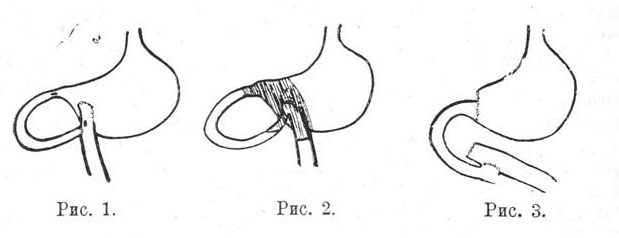 Через 2 недели после операции быстро нарастающие явления перитонита. 29/1V срочная операция (Ф. Ю. Роз е). Между г.—э. и э. э. язва в 15-ти коп. «сер. монету в предперфоративном состоянии. В брюшной полости серозный выпот. Excisio язвы с последующим швом. Назначена щелочная терапия. Б-ой заметно поправился. Через 1/2 года явления рецидива пептической язвы. 18/Х 3-я операция (Ф. Ю. Роз е). На месте первой пептической язвы развилась новая язва в 20-копеечную серебряную монету ближе к г. э. Уплотнение, бывшее в области привратника, рассосалось, остались более или менее рыхлые сращения. Привратник свободно пропускает палец. Э. Э. приблизился к г.-э. Excisio язвы (рис. 1). После третьей операции б-ой ежегодно ездил в Кисловодск.