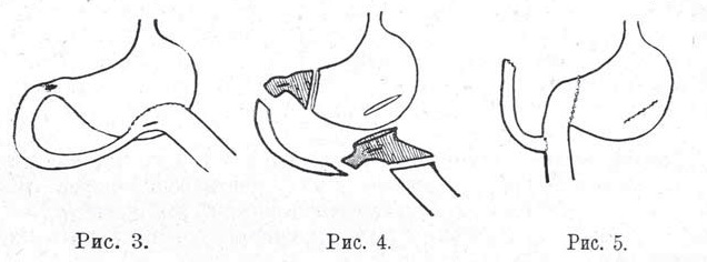 Через 6 лет рецидив пептической язвы. 22/1Х 1922 г. 4-ая операция (Ф. Ю. Розе). Колоссальные сращения в области г.-э. и э. э. Отводящая петля тонкой кишки резко расширена (рис. 2). Произведена обширная резекция в одном куске привратника и значительного отдела желудка вместе с пептической язвой анастомоза. Таким образом образовалось четыре отверстия. Отверстие желудка вшито в 12-перстную кишку по Билльроту 1. Отрезки тощей кишки, участвовавшие в гастро-энтеро-анастомозе, сшиты бок о бок. Следовательно, этим оперативным вмешательством мы восстановили нормальные соотношения желудка и тощей кишки, не считая резекции отдела желудка (рис. 3).