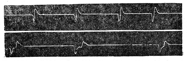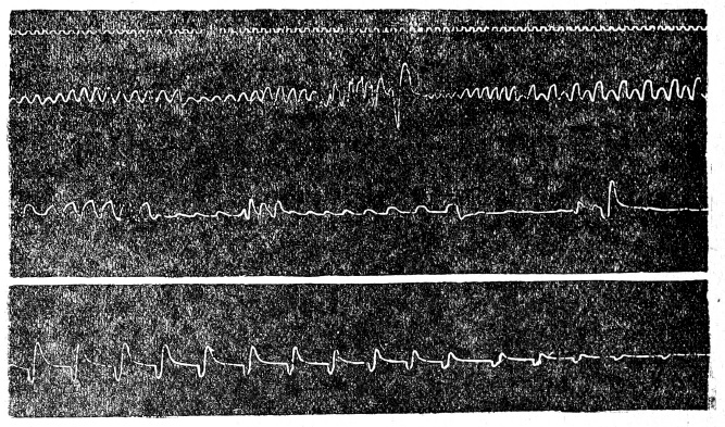 Периодическое дыхание носило волнообразный характер, временами с переходом в тип respiratio alternans (рис. 1, верхняя кривая). В дальнейшем неправильные группы чередовались с апноическими фазами 10—12 сек. продолжительности (рис. 1, средняя кривая).