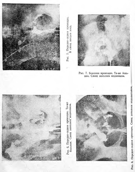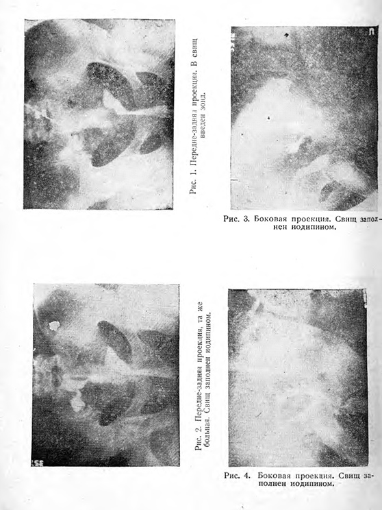 В качестве контрастного вещества для заполнения свищевых ходов нами применялся иодипин 40% или советский препарат иодолипол 30%, который давал прекрасную тень — по интенсивности своей, пожалуй, превосходящую тень от иодипина; для заполнения полости матки мы применяли эти же препараты. Хотя обычно, при метросальпингографии мы пользовались иодипином 20% с хорошим, в смысле контрастности, результатом, — мы предпочли для исследования свищей иодипин 40%, т. к. контрастность последнего в этой большей концентрации давала возможность точно выявлять весьма, иногда, тонкие ходы свища, связывающие, подчас, более обширные свищевые полости.
