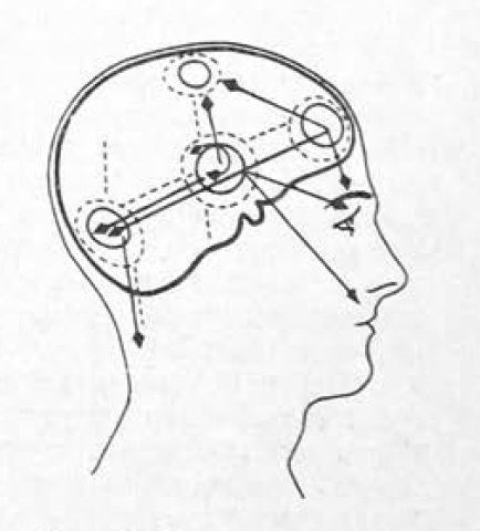 Локализация боли, определяемая самими больными, и иррадиация болей из основного очага могут относиться к различным отделам: лобному, височному, затылочному, реже к теменному. Боли могут быть с одной или обеих сторон черепа, могут быть и по срединной линии, в частности у основания носа (см. рис. 1). Иррадиации боли идут от указанных участков к другим. Заслуживают внимания иррадиации болей в затылочно-глазном направлении (H. Н. Бурденко, В. В. Крамер), от одного виска к другому, в области разветвления тройничного нерва, в верхнешейный отдел (И. Я. Раздольский), глазные впадины (Л. Б. Литвак) и др.