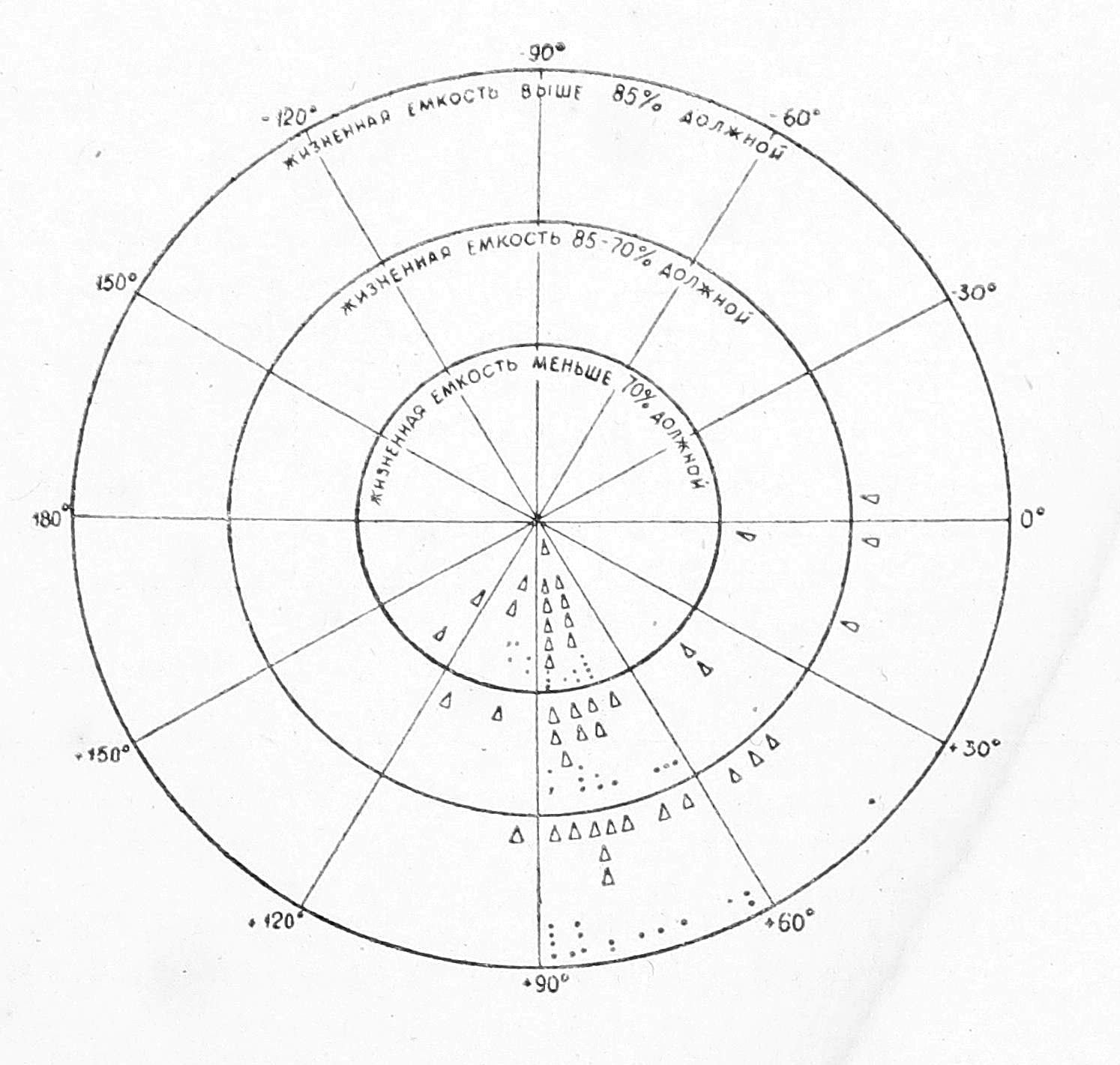 При сопоставлении величин ЖЕЛ и ЭКГ-данных прежде всего были подвергнуты изучению изменения векторов предсердных волн и комплексов QRS (см. рис. 1).