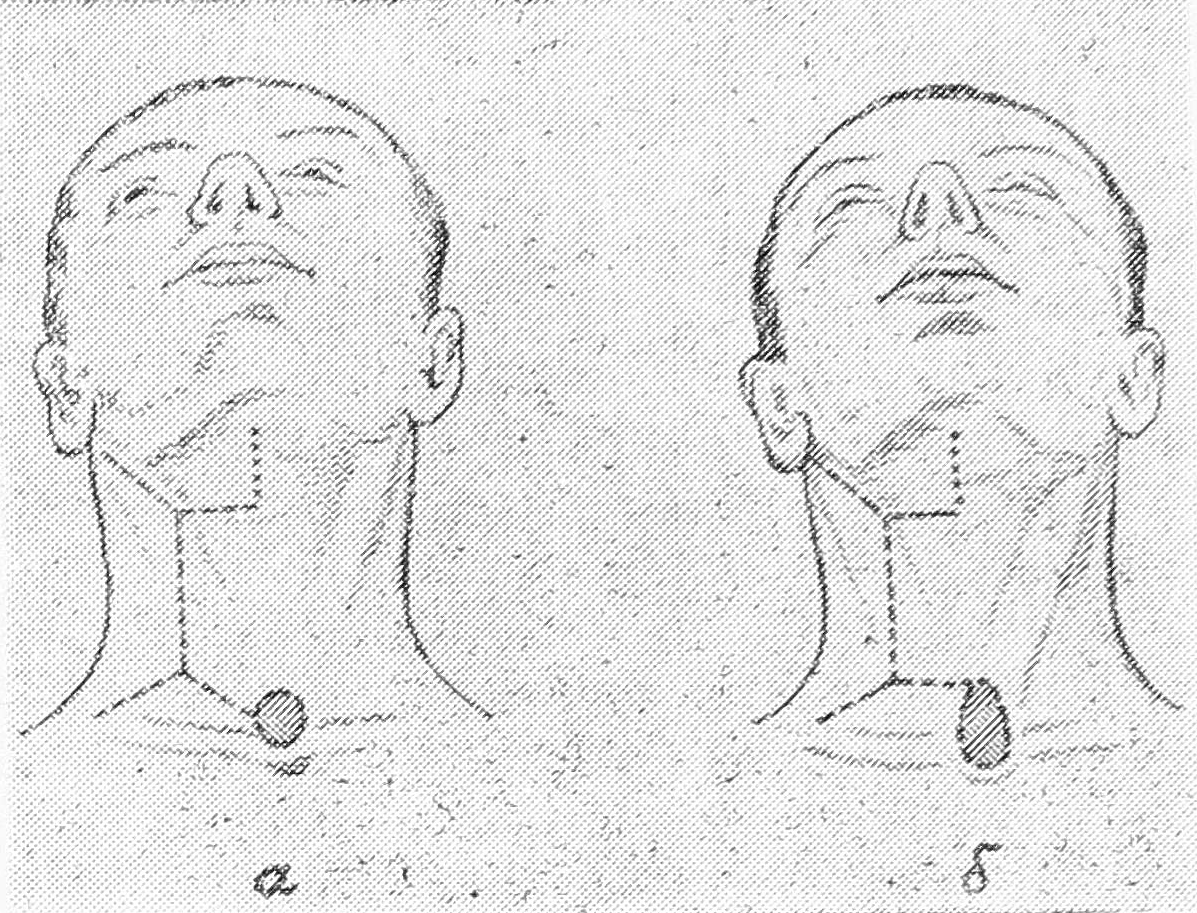 б) В отличие от Мартина, для вшивания культи трахеи мы иссекаем участок кожи круглой или слегка эллипсовидной формы (2 см в диаметре), в конце разреза, идущего к надгрудинной ямке (рис. 1-а). Если же больной до операции подвергался трахеотомии, то нижне-передний разрез проводим к верхнему краю трахеостомы; иссекаемый участок кожи в таких случаях имеет грушевидную форму (рис. l-б). Разрезы кожи удобнее производить по линиям, проведенным метиленовой синькой.