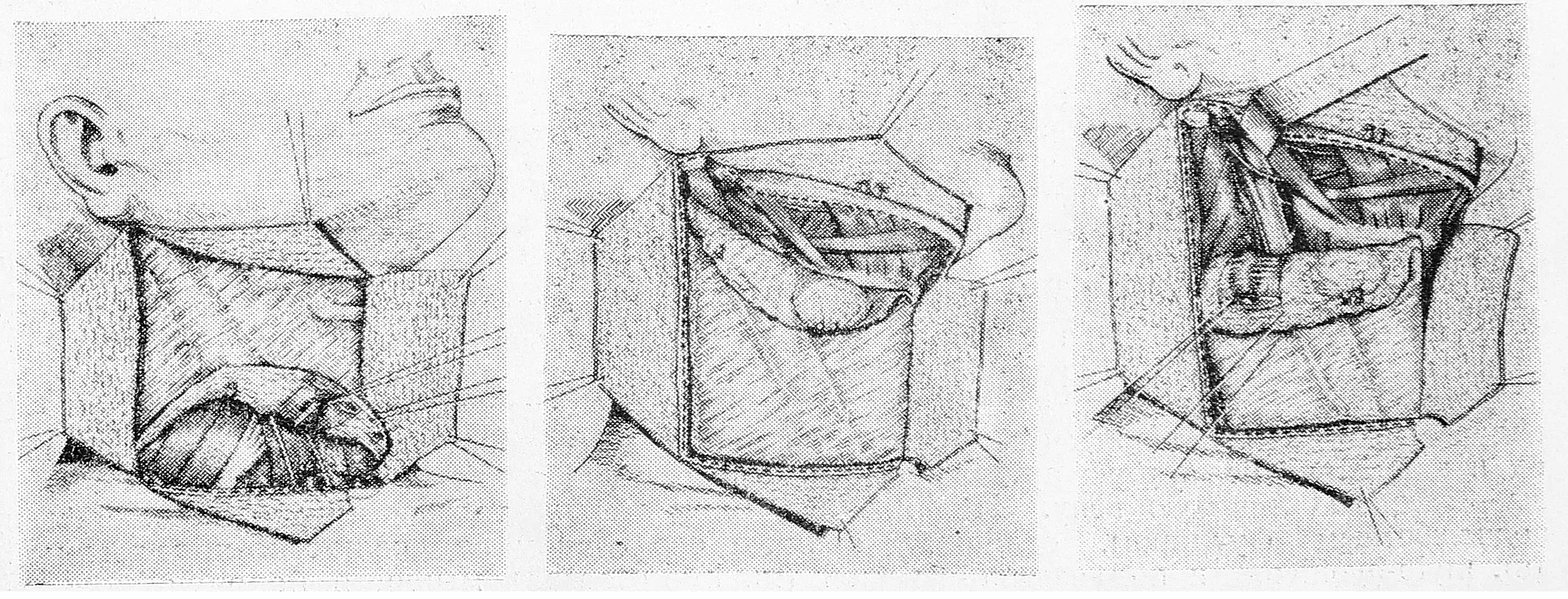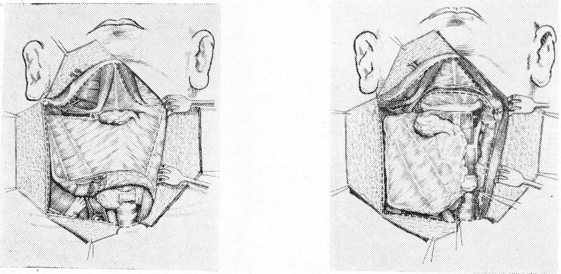 а) Разрез, идущий от верхней точки вперед, мы проводим не к подбородку, а с середины подъязычной кости (рис. 1-а). Это отступление от типичного разреза вызвано тем, что опорожнение подчелюстной области при раке, не выходящем за пределы гортани, обычно не производится, кроме того, наш вариант разреза дает возможность дренировать полость глотки с помощью резиновой трубки (зонд-дренаж), а в случае необходимости позволяет сформировать фарингостому, что в значительной мере снижает частоту послеоперационных нагноений, столь опасных при обнажении сонной артерии. В тех случаях, когда опухоль распространяется на черпало-надгортанные складки или выходит за пределы гортани, широкий доступ к подбородочной и подчелюстной областям получают после дополнительного разреза, проведенного от середины подъязычной кости к подбородку.