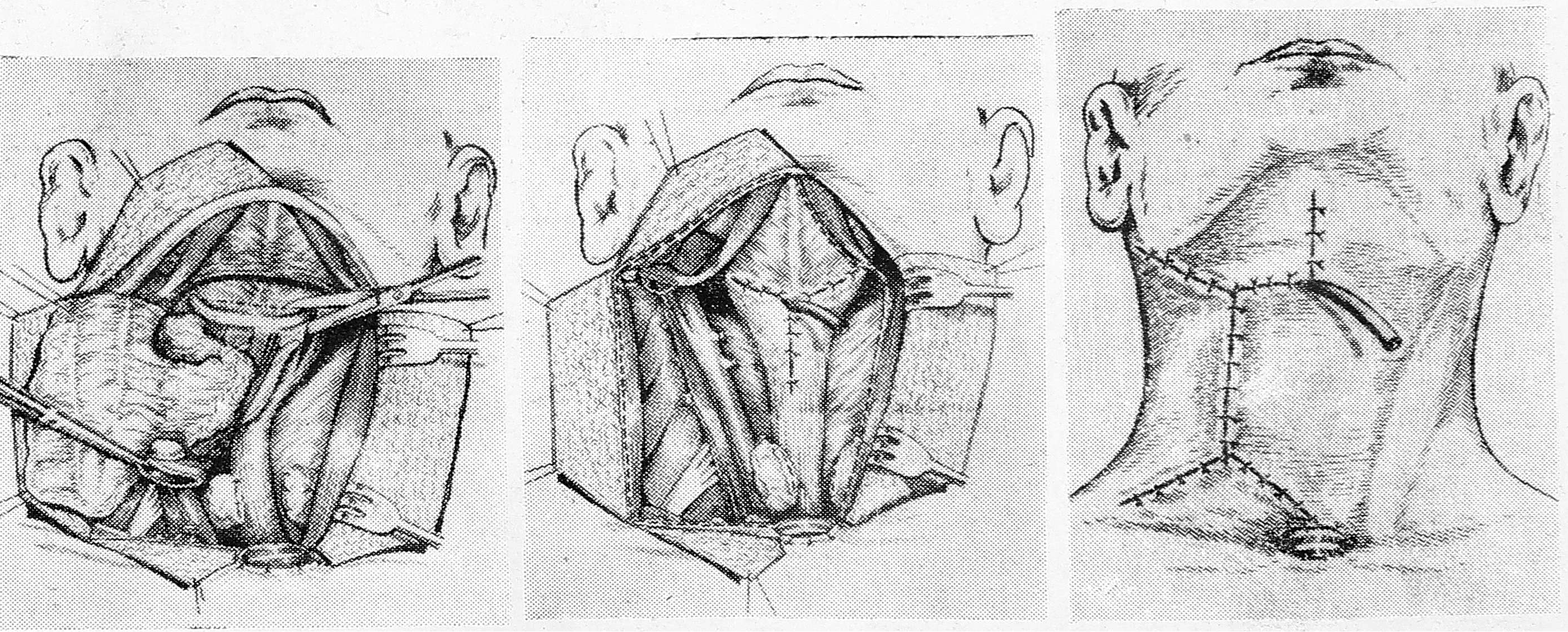 Створчатые разрезы дают широкий доступ к гортани и боковой поверхности шеи, однако при этом нередко возникают некрозы кожных лоскутов, что, по-видимому, связано не только с их величиной, но и с теми изменениями в коже шеи, которые происходят под воздействием большой дозы лучистой энергии, полученной до операции. U-образный разрез, обеспечивая доступ к гортани и боковым поверхностям шеи, недостаточен для опорожнения наружного угла надключичной ямки, не дает возможности сформировать фарингостому, необходимость которой нередко выясняется в процессе операции. Если учесть, что в послеоперационном периоде швы, наложенные на слизистую глотки, часто оказываются несостоятельными, вследствие чего инфицированная слизь из глотки проникает в рану и вызывает нагноение, то станет понятной нежелательность такого разреза при операциях, сопровождающихся обнажением сонной артерии.