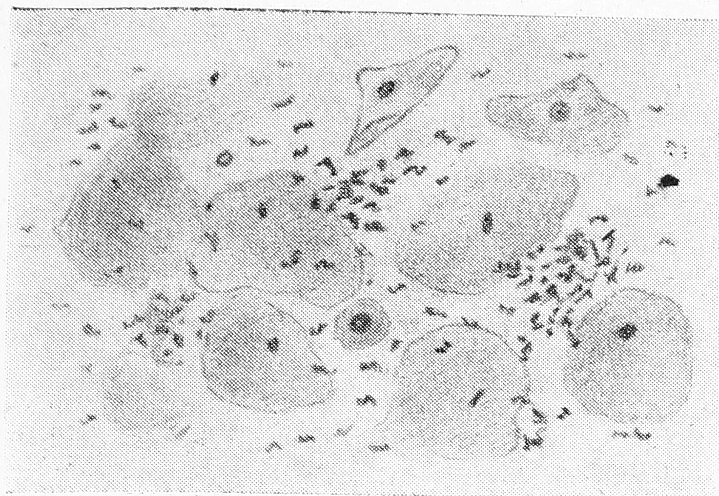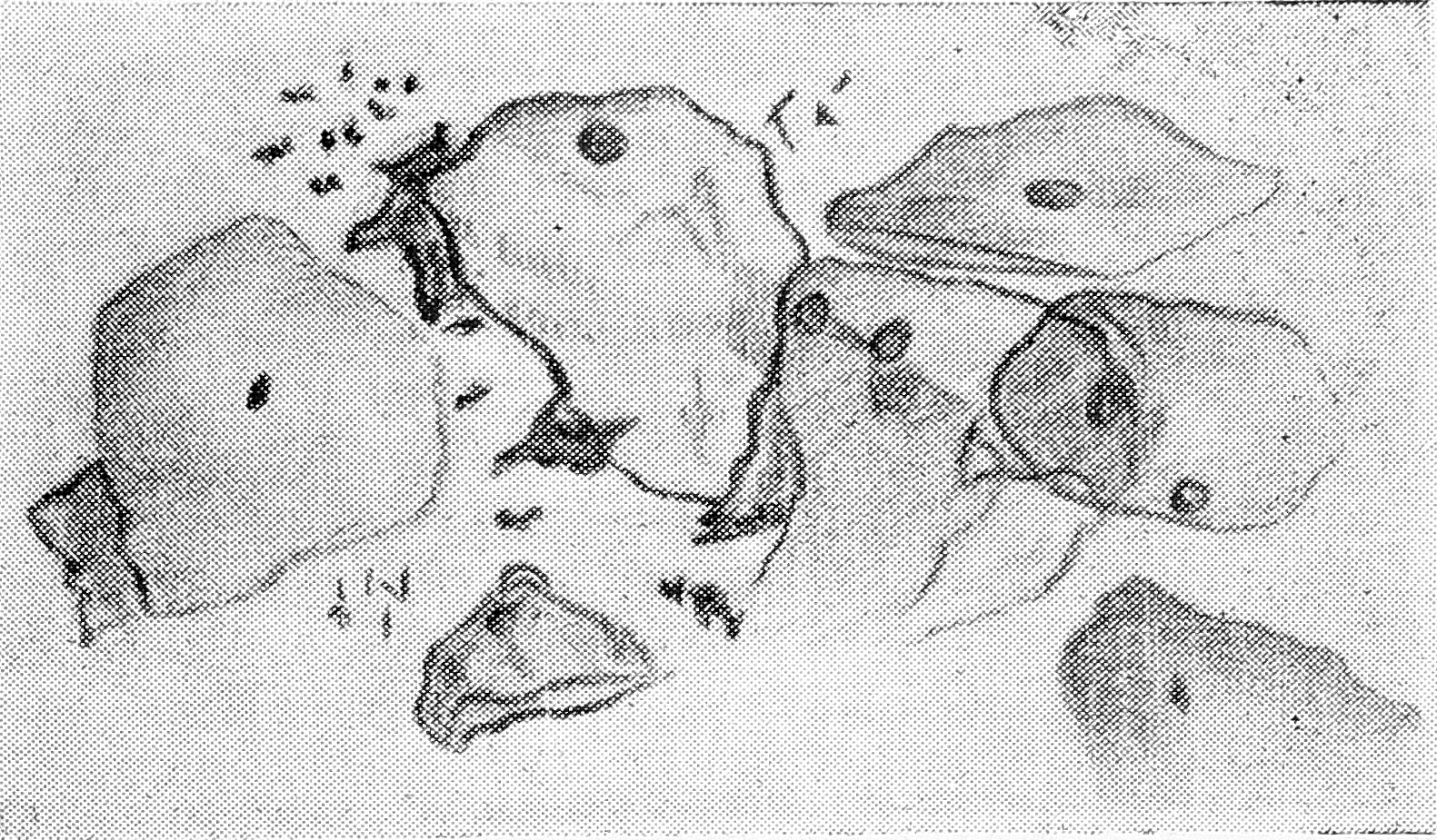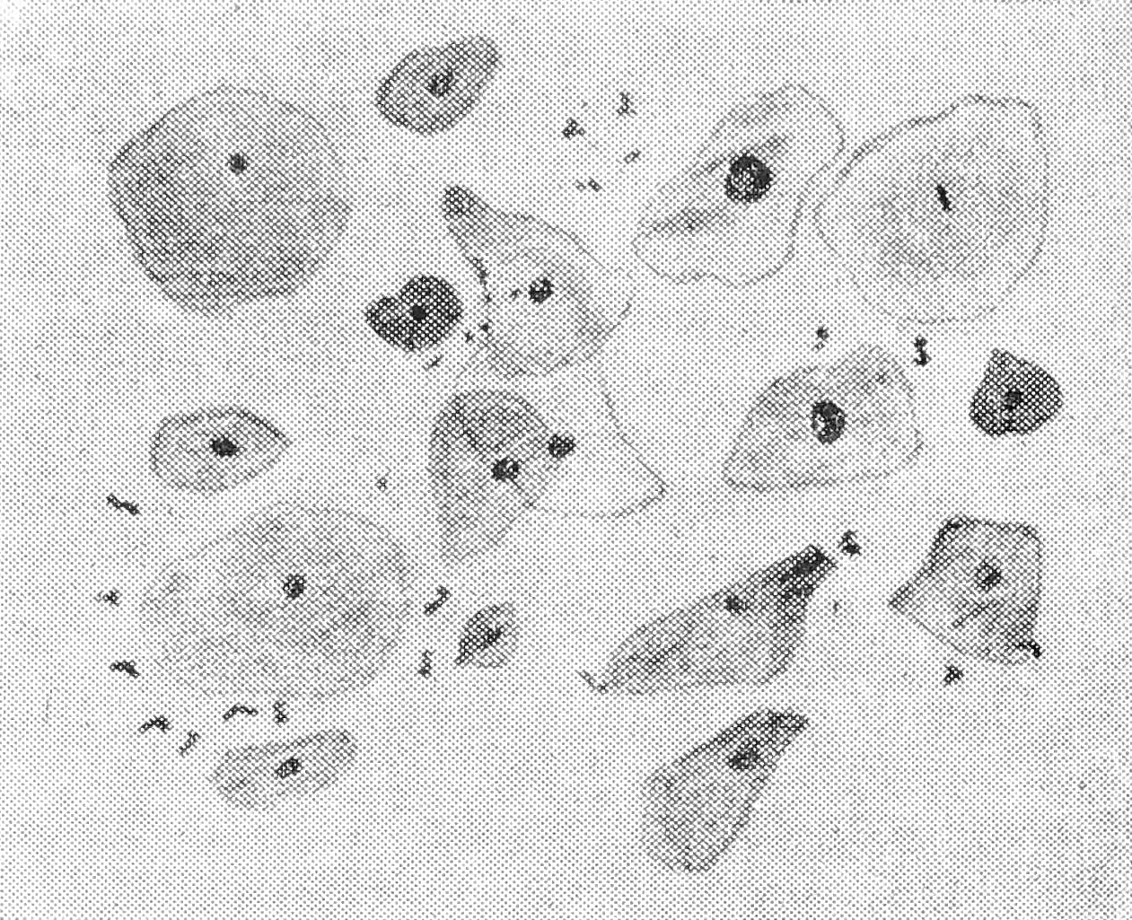 Мазки изучались в динамике, насколько было возможно, через 2 дня на 3-й. Они брались при помощи длинного пинцета из заднего и одного бокового свода влагалища на предметное стекло. После высушивания на воздухе помещали на 5—7 мин в краску Романовского, в которую добавлено равное количество ацетона и воды.