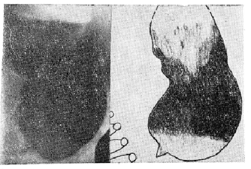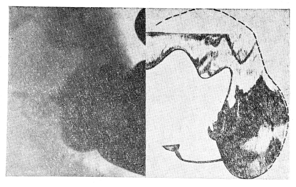 При наличии пилоростеноза иногда можно отметить значительное увеличение размеров желудка. Перистола, как правило, вялая, контрастное вещество свободно опускается в желудок. Довольно часто складки слизистой желудка утолщены и к тому же извиты. Перистальтика долгое время сохраняет свою силу, иногда она усилена; во многих случаях по большой кривизне одновременно определяется до 3—4 перистальтических волн. В области пре- и пилорического отделов желудка перистальтика обычно прерывается. Через 10—15 мин. от начала дачи контрастного вещества начинает выполняться суженный пилорический канал, который предстает в виде нитевидной тени различной длины (от 3 мм до 1—2 см) при диаметре 1,5—3 мм. Очень часто проникшая в суженный пилорический отдел бариевая взвесь вновь возвращается в желудок. При дальнейшем поступлении контрастного вещества по суженному пилорическому каналу выявляется наполнение луковицы двенадцатиперстной кишки, которая представляется в виде колпачка (рис. 1). В это время производятся прицельные снимки. Получением этих данных, патогномоничных для врожденного пилоростеноза, заканчивается исследование, которое, таким образом, является однократным и непродолжительным.