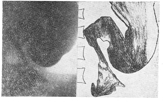 Далеко не всегда удается выполнить суженный пилорический канал на всем протяжении. Тщательное исследование области пилора дало нам возможность заключить, что «клювовидное» выпячивание в этой области является также достоверным рентгенологическим признаком врожденного пилоростеноза и отображает начальную часть суженного отдела пилорического канала. По-видимому, резкое сужение канала, стойкий вторичный спазм, не снимающийся аминазином, упорно препятствуют прохождению контрастного вещества из желудка в кишечник (рис. 2).
