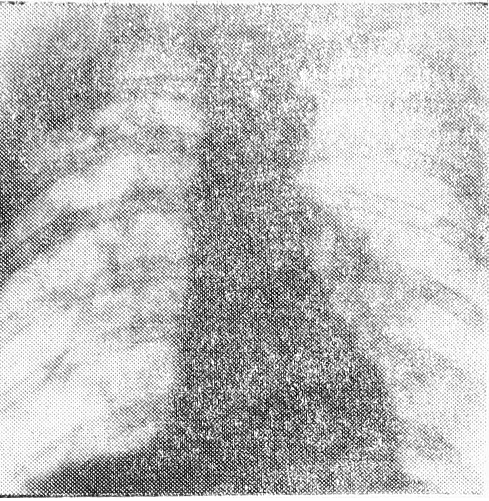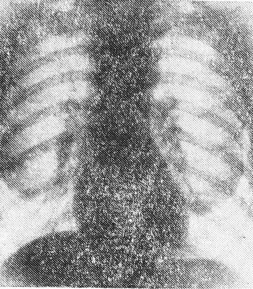 Рис. 5. Уплотнение, расширение, изменение структуры корней легких с петрифицированными лимфатическими узлами на крупнокадровых флюорограммах выявляются особенно отчетливо.