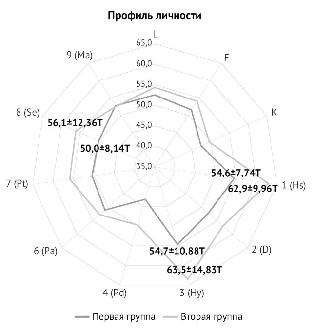 Рис. 1. Усреднённые профили, выявленные по сокращённому многофакторному опроснику для исследования личности (СМОЛ), наблюдаемых (Т-баллы). Обозначение шкал СМОЛ: L — лжи; F — достоверности; K — коррекции; 1 (Hs) — ипохондрии; 2 (D) — депрессии; 3 (Hy) — истерии; 4 (Pd) — психопатии; 6 (Pa) — паранойяльности; 7 (Pt) — психастении; 8 (Se) — шизоидности; 9 (Ma) — гипомании