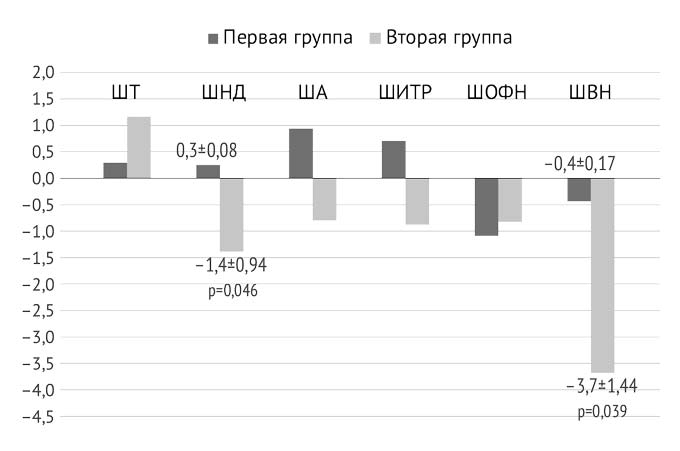 Результаты оценки уровня невротизации пациентов представлены на рис. 2. При интерпретации опросника доказанным уровнем болезненного характера выявляемых расстройств считают значения от –1,28 и ниже.