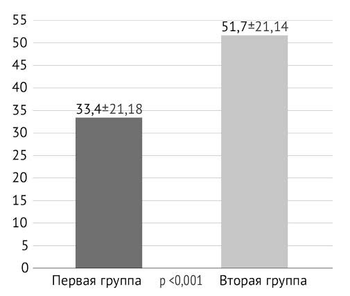 В сравниваемых группах обнаружено существенное снижение когнитивных функций у пациентов второй группы — 23,9±4,10 балла по сравнению с 26,8±2,50 балла в первой группе (U=427; р <0,001).