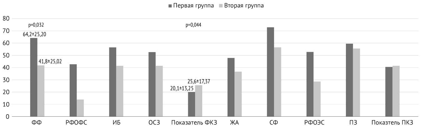 По результатам опросника SF-36 существенная разница обнаружена по шкале «Физическое функционирование» (U=554; р=0,032) и показателю «Физический компонент здоровья» (U=573,5; р=0,044) между первой и второй группами пациентов.