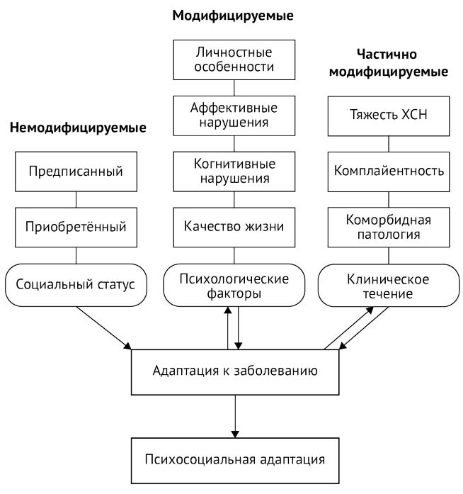 Предполагают, что в процессе адаптации к заболеванию принимают участие три группы факторов: социальный статус, психологические факторы и клиническое течение заболевания. Данные группы факторов могут быть немодифицируемыми, модифицируемыми и частично модифицируемыми. При персонифицированном подходе к пациенту врач учитывает те факторы, которые способен откорректировать, что позволит пациенту с ХСН лучше адаптироваться к заболеванию.