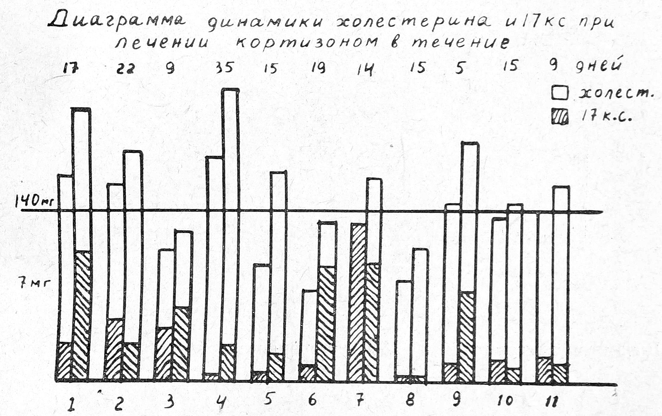 Рис. 1. Динамика холестерина и 17-кетостероидов при лечении кортизоном. Цифры над столбиками — дни лечения.
