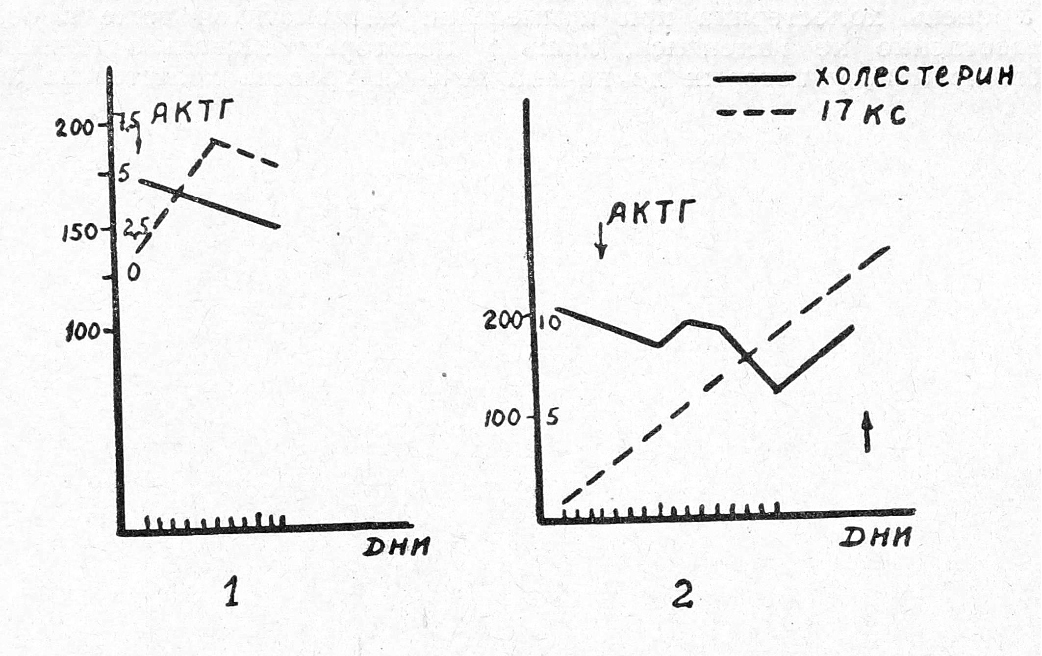 Рис. 2. Динамика холестерина и 17-кетостероидов при первом и втором курсах лечения АКТГ.