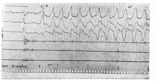 Переход к медленному номотопному ритму сам по себе не прекратил судорог. После прекращения трепетания желудочков прошло еще 9,2 сек. Сердце «успело» за это время сократиться только три раза, и этих трех полноценных систол оказалось достаточно для ликвидации резкой аноксии мозга и прекращения судорог. Больная пришла в сознание еще через 0,8 сек. после окончания судорожного периода.