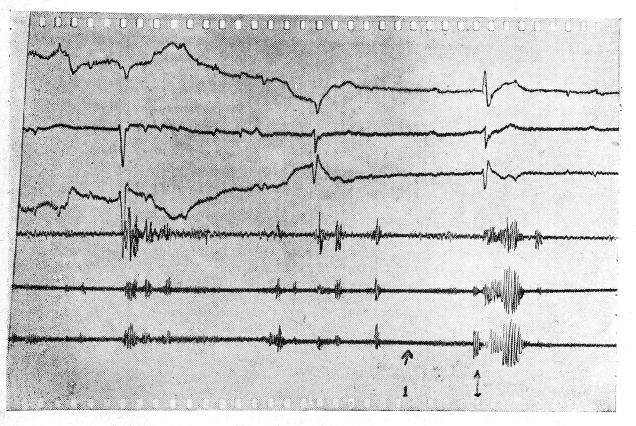 Рис.2 Окончание приступа Эдеме — Стокса. В правой части рисунка левая стрелка обозначает окончание периода судорог, правая — окончание приступа Эдеме — Стокса. «RFT»-6NEK-1, 50 мм/сек. Обозначения те же, что на рис. 1.