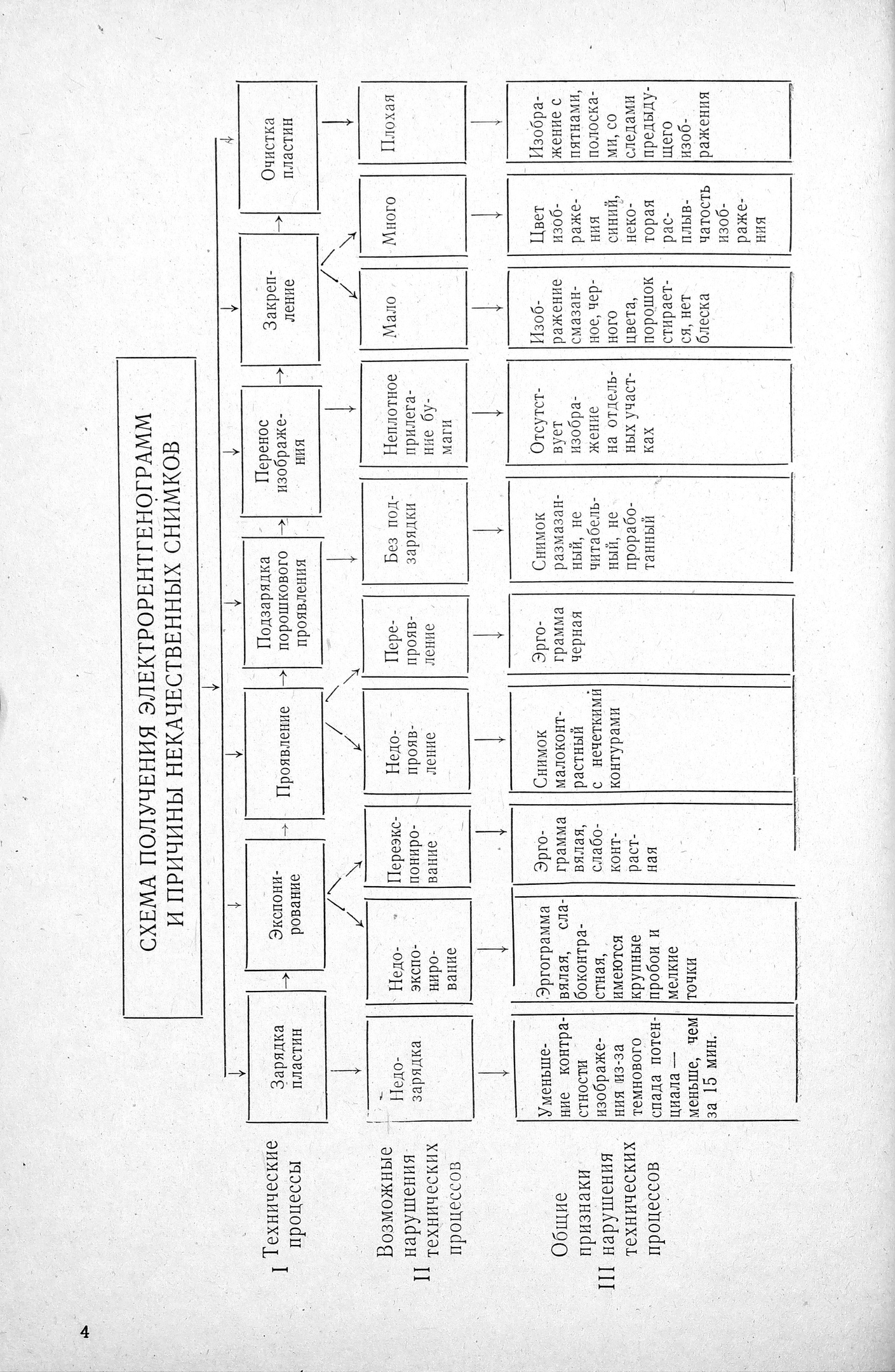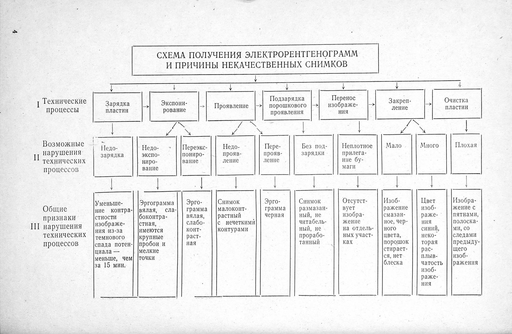 Ввиду того, что электрорентгенография является новым методом и принципиальные основы получения ЭРГ мало известны большинству врачей, приводим некоторые сведения о ней. В отличие от обычной пленочной рентгенографии, при электрорентгенографии видимое изображение получается на селеновой пластине, которое затем переносится на лист бумаги. Аморфный селен-полупроводник обладает свойством образовывать фототок при облучении. Если между рентгеновскими лучами и селеновой пластиной находится предмет, например часть человеческого тела, то на поверхности селенового покрытия после облучения остается заряд, представляющий скрытое электростатическое изображение просвечиваемого объекта-органа, так называемый потенциальный рельеф. Это невидимое изображение выявляют с помощью проявляющего порошка, который осаждается на поверхности селеновой пластины в виде рисунка различной плотности. Плотность проявляемых участков видимого слоя обусловливается выраженностью скрытого электростатического изображения. На следующем этапе изображение с поверхности селеновой пластины переносится на бумагу и прово-дится закрепление (см. схему). Весь1 процесс получения снимка идет 2—3 мин.