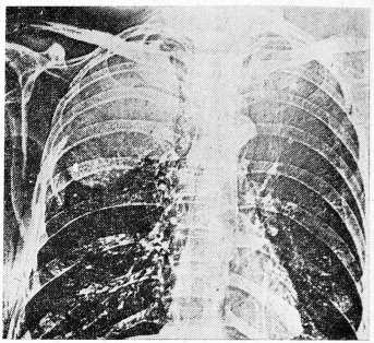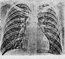 Рис. 5. Прямая электрорентгенограмма больного Н. Периферический рак верхней доли правого легкого. Отчетливо видна утолщенная междолевая плевра справа. В нижнем поле справа определяется нормальный легочный рисунок; слева в верхних полях легочный рисунок почти не виден, а в нижнем поле легочный рисунок значительно обеднен.