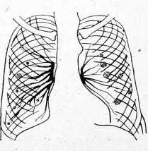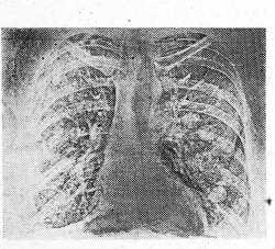 При сопоставлении 350 ЭРГ с рентгенограммами органов грудной клетки оказалось, что на ЭРГ малые рентгенологические признаки были видны в избыточном количестве в 50 %; в 25 % случаев эти детали было трудно интерпретировать, а в 25% они не выявлялись (рис. 5). Мелкие очаги, множественные диссеминированные, типа милиарного обсеменения, лучше отображаются на ЭРГ.