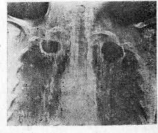 Большие рентгенологические признаки, т. е. тени, определяемые без всякого сомнения как в норме, так и в патологии, отображаются одинаково и на пленке, и на ЭРГ. На ЭРГ бывают отчетливо видны фокусы пневмонического затенения, абсцессы, опухоли, каверны, кисты, гидрои пневмотораксы, гиперплазированные лимфатические узлы в корнях, дуги срединной тени и т. д. (рис. 4 и 5).