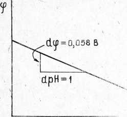 Эта модификация формулы Нернста лежит в основе pH-метрии. Она удобна тем, что потенциал электрода связан с pH раствора линейной зависимостью (см. рис. 1). Угловой коэффициент прямой d(p/d pH ——0,058, то «есть при измерении pH на единицу (d pH = 1) потенциал электрода меняется на величину d(p = — 0,058В. Знак минус свидетельствует о том, что наклон кривой отрицателен.