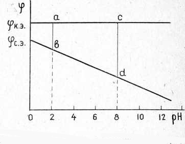 Рис. 1. Изменение потенциала электрода, обладающего водородной функцией, в зави симости от pH.