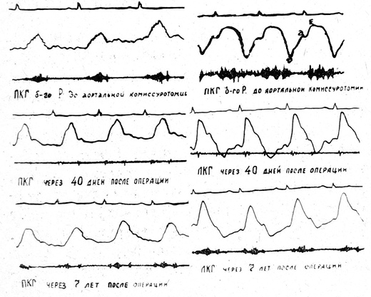 В качестве примера приводим ПКГ и ЛКГ больного Р. до аортальной комиссуротомии и после нее (см. рис.). До операции сфигмограмма отличалась малой амплитудой, медленным пологим восходящим коленом с зазубринами, совпадавшими с ромбовидным систолическим шумом, пик максимальных осцилляций которого располагался во II половине систолы. Систолическая волна ЛКГ имела куполообразную форму, что указывало на более медленное опорожнение левого желудочка через суженное отверстие. Подобные изменения ПКГ и ЛКГ характеризовали выраженный стеноз устья аорты. После аортальной комиссуротомии через 40 дней восходящее колено сфигмограммы стало более крутым (угол подъема составил 84° при 50°до операции), систолический шум на ФКГ не регистрировался, систолическая волна ЛКГ нормализовалась, вершина ее стала более острой. Через 7 лет на ФКГ появился веретенообразный систолический шум и более пологое восходящее колено сфигмограммы. Достоверной динамики ЛКГ не обнаружено. У 69 больных была сглажена или отсутствовала инцизура на нисходящем колене ЭКИ аорты, видимо, вследствие рубцовых изменений полулунного клапана аорты и уменьшения его колебаний. При анализе ЭКИ левого желудочка выявлено значительное увеличение ее амплитуды, у 32 больных констатировано диастолическое плато и у 78-—более пологий, чем у здоровых лиц, систолический спуск. Последнее можно объяснить более медленным опорожнением левого желудочка в связи с наличием препятствия току крови.